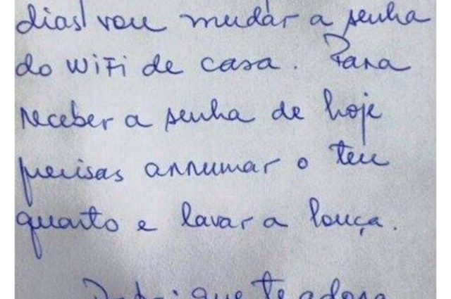Continue lendo…Circula pela internet um bilhete que um pai teria deixado para a filha trocando a senha do wi-fi por bom comportamento (foto). Não sei se o pai Paulo e a filha Catarina são pessoas da vida real ou se isso faz parte de alguma publicidade que vem pela frente, mas o fato é que quem tem filho pequeno como eu precisa aprender os castigos dos tempos modernos!! Que loucura, né?